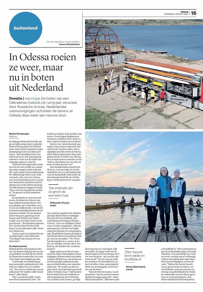 Dit weekend stond in Trouw een artikel van Michiel Driebergen over de actie Boten voor Odesa. Tijdens een bombardement in december 2023 werd het botenhuis van roeiclub Chornomorets verwoest. Nederlandse verenigingen hebben daarop een actie gestart en meer dan 50 boten, 140 roeiriemen en voor een groot bedrag aan onderhoudsmateriaal gedoneerd! Nu kunnen de leden van de club weer het water op en dan hun leven in oorlog even vergeten.