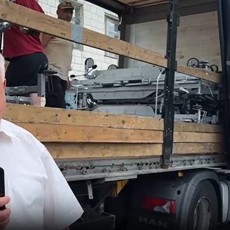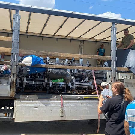 Generator from Aarhus hospital (Denmark) is loaded onta atruck for transport to Odesa