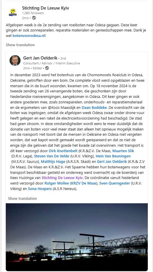 Een bijzondere actie deze week. In december 2023 was roeivereniging Chornomorets 🚣 in Odesa gebombardeerd waarbij het hele botenhuis werd verwoest met alles wat erin stond, zie het bericht op The New Voice of Ukraine’. Eerder al was één van de clubleden met zijn moeder naar Nederland gevlucht en bij Viking in Utrecht gaan roeien.