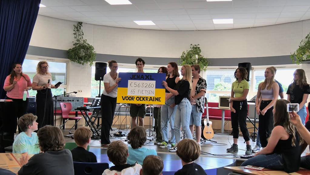 RTV Focus Zwolle was op de JenaXL School bij de overhandiging van de cheque van €5.632,60 en 65 fietsen aan Stichting De Leeuw Kyiv. De school had in de voorafgaande maand allerlei acties georganiseerd om het geld en de fietsen in te zamelen. De finale van de actiemaand was op 4 juli en toen hebben de fietsen ook nog een opknapbeurt gekregen.Veel dank JenaXL School in Zwolle!Het fragment is hier te zien.